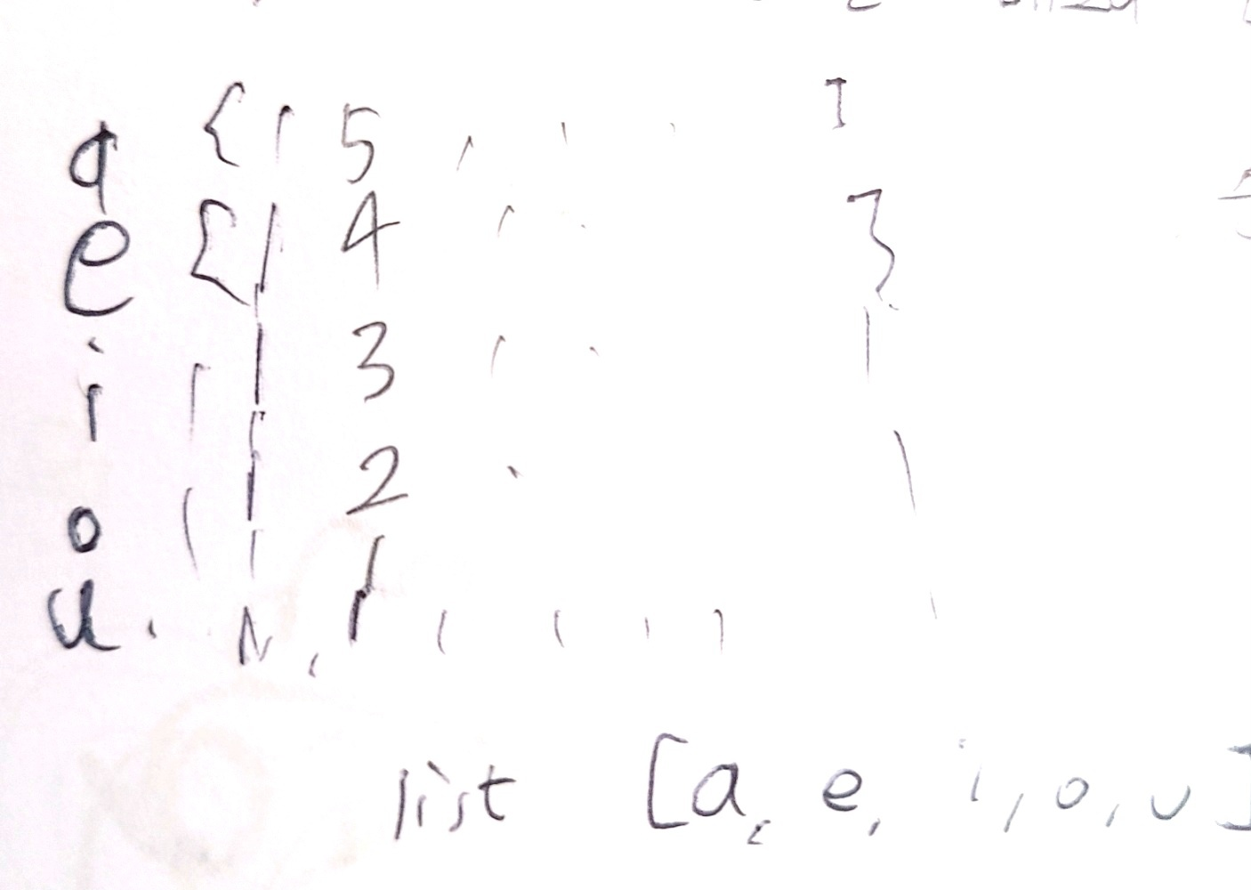 aeiou 각 문자를 키로하고, value는 int[50] 크기의 배열인 해시맵이다. * 제약사항 1 <= n <= 50
